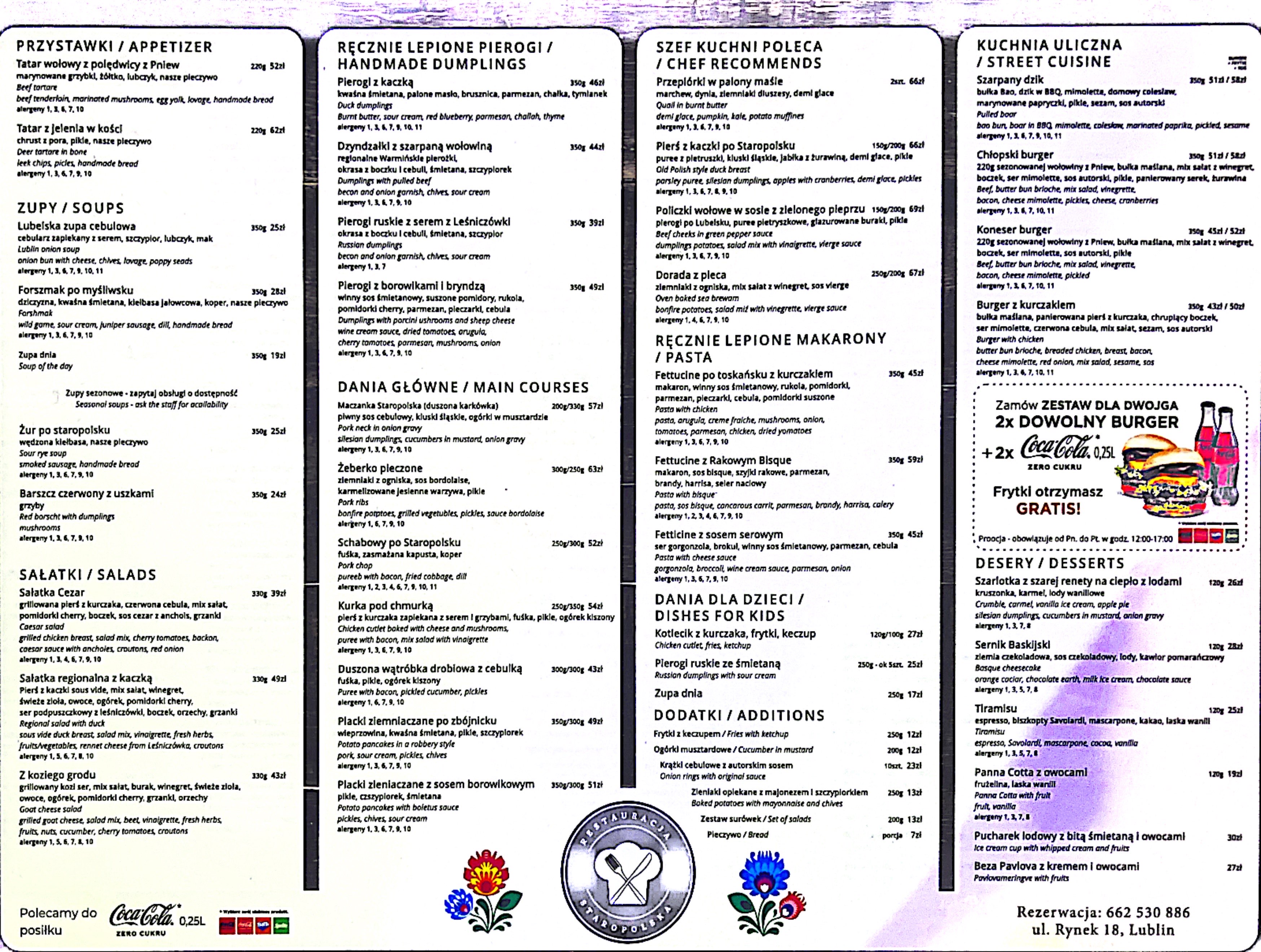 CALL +48818593037Witamy w Restauracji Staropolskiej, położonej w pięknym mieście Lublin. Nie możemy się doczekać, aby gościć Cię jako naszego gościa! Zostaniesz przywitany prawdziwą gościnnością i wspaniałą ofertą kuchni polskiej, która zaspokoi Twoje gusta. Zapraszamy na nasz pyszny słodki deser. W ofercie alkohol, wino, kawa i herbata. Usiądź i ciesz się umiejętnie przygotowanym jedzeniem: coś, co zaspokoi każdy gust. Spróbuj tutaj najlepszych produktów regionalnych i tradycyjnej kuchni. Zapraszamy na brunch, lunch, kolację i podwieczorek w naszym stylowym lokalu. Szukasz czegoś więcej niż tylko jedzenia? Mamy miłe lunche biznesowe i spotkania biznesowe.